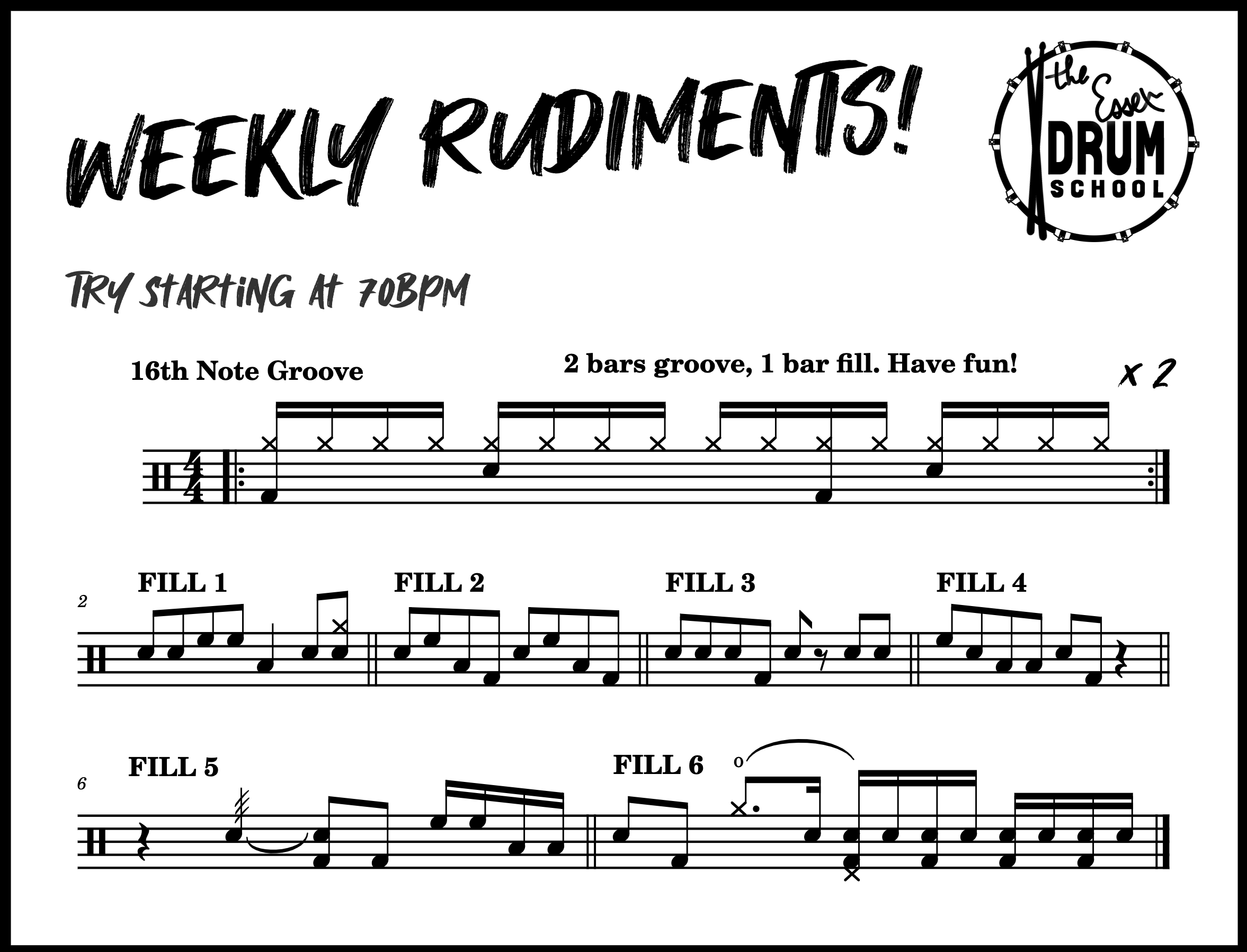 Weekly Rudiments 13 Mar Written By Ben Bashi This one’s an RnB groove to fill exercise and very fun. Remember to count semiquavers (1 e & a) and quavers (1 &). Bar 6 has a snare drum roll! Enjoy. Ben Bashi
